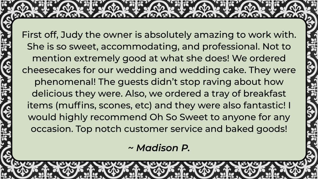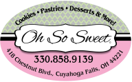Oh So Sweet opened in 2015 on Sackett Avenue before moving into our current location on Chestnut Boulevard in 2020. We’ve been happily serving fresh-baked, from-scratch desserts to Cuyahoga Falls for 10 years now!